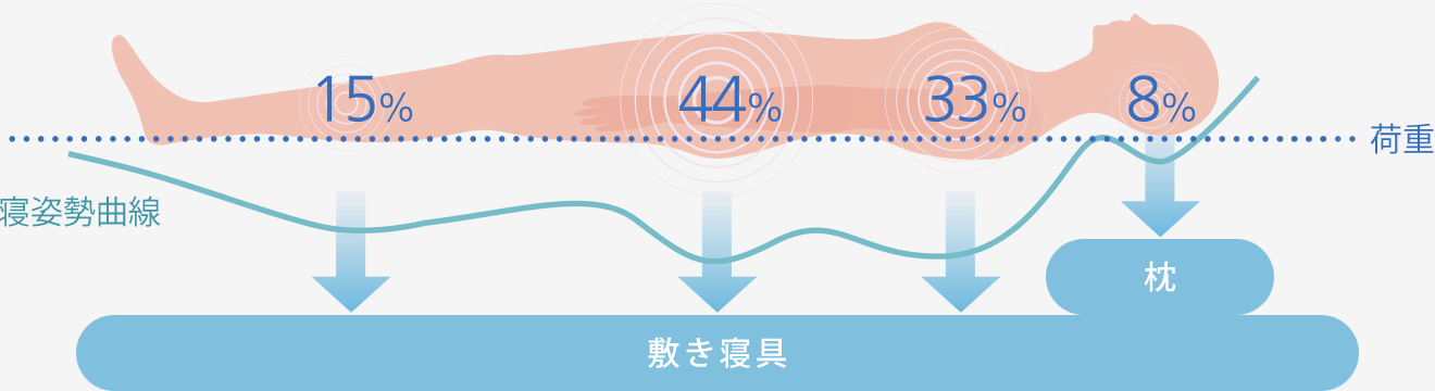 実は眠りに一番大切と言えるのが敷きふとんです。心と身体を回復させるために欠かせない「深い眠り」には、個人差はありますが、50kg前後~多い方では100kg以上の体重をバランス良く分散させ、寝ている間の姿勢を正しく保持してくれるものを選ぶことが大切です。